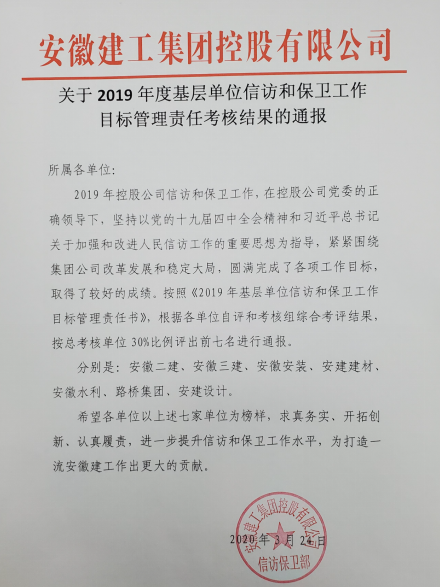 安徽二建信訪保衛工作在公司黨委的正確領導下,圓滿完成了2019年的各項工作任務。集團信訪保衛部組織的2019年基層單位信訪和保衛工作目標管理責任書》考核評比榮獲第一名。